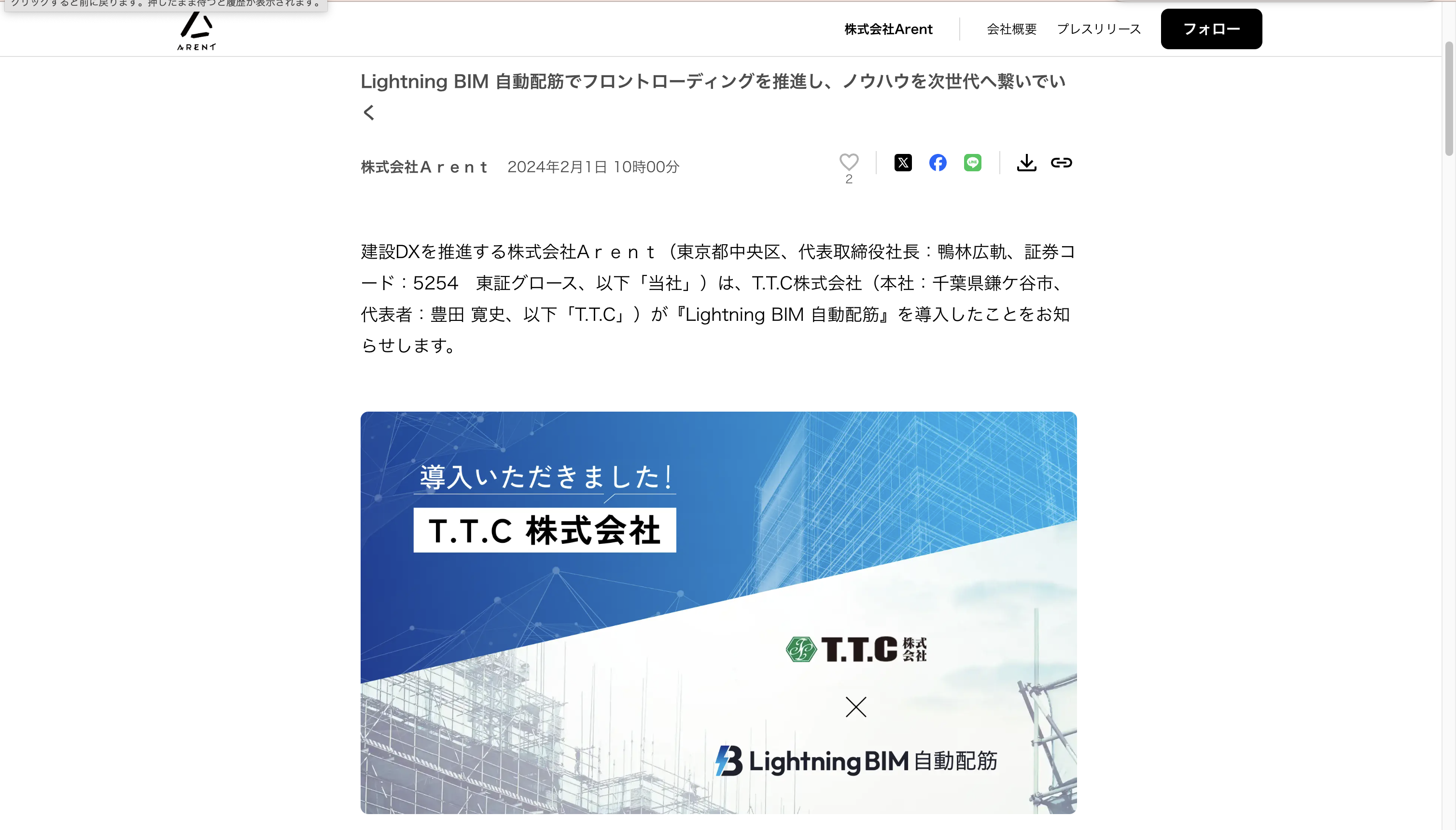【お知らせ】Arent社からT.T.Cの活動についてプレスリリースが配信されました!
