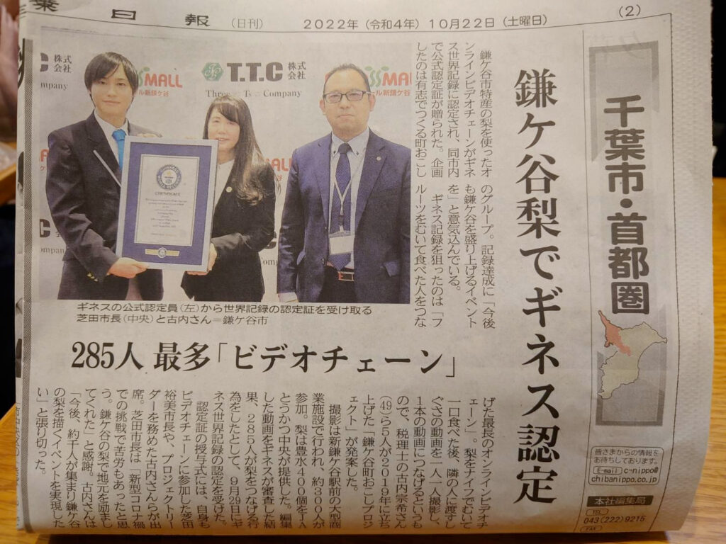 T.T.Cが協賛してます鎌ケ谷街おこしプロジェクトにて行った、梨を使ったオンラインビデオチェーンがギネス世界記録を達成しました!